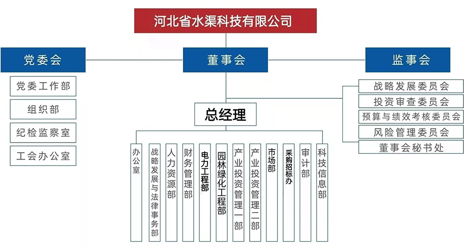 河北省水渠科技有限公司在成立之初即按照《公司法》和省政府的要求,設(shè)立了股東會、董事會、監(jiān)事會、總經(jīng)理辦公會等各司其職、互相制衡、規(guī)范運作的法人治理結(jié)構(gòu)。集團總部設(shè)總經(jīng)理辦公室、綜合管理部、工程部、財務(wù)稽核部、項目研發(fā)等職能部門。